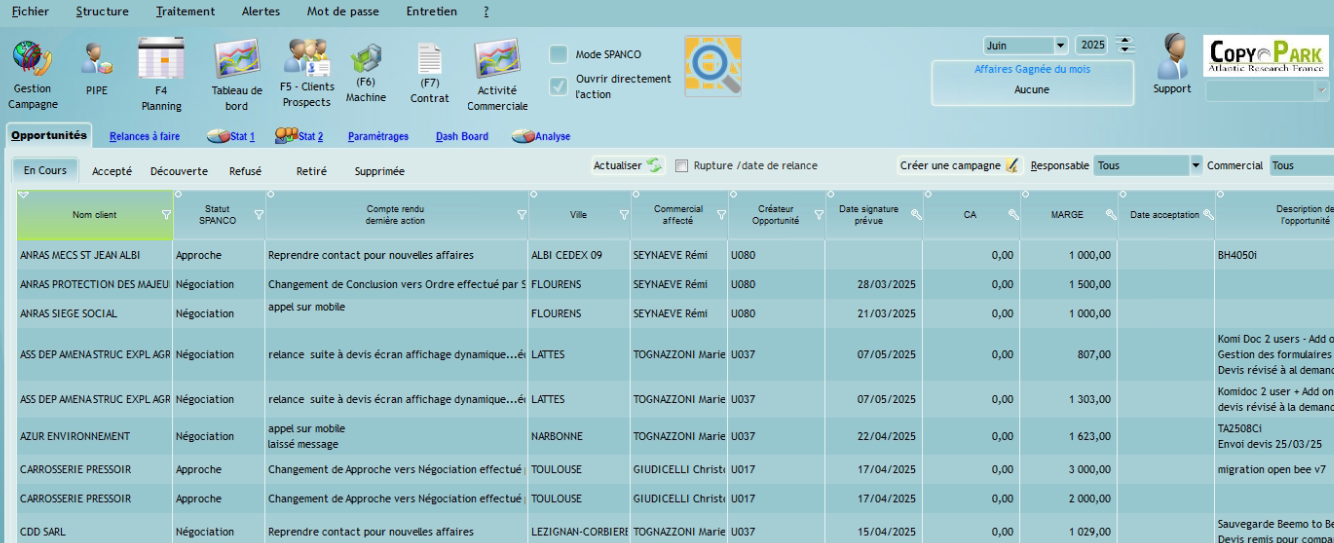 - Statistiques graphiques du portefeuille et du suivi du pipe